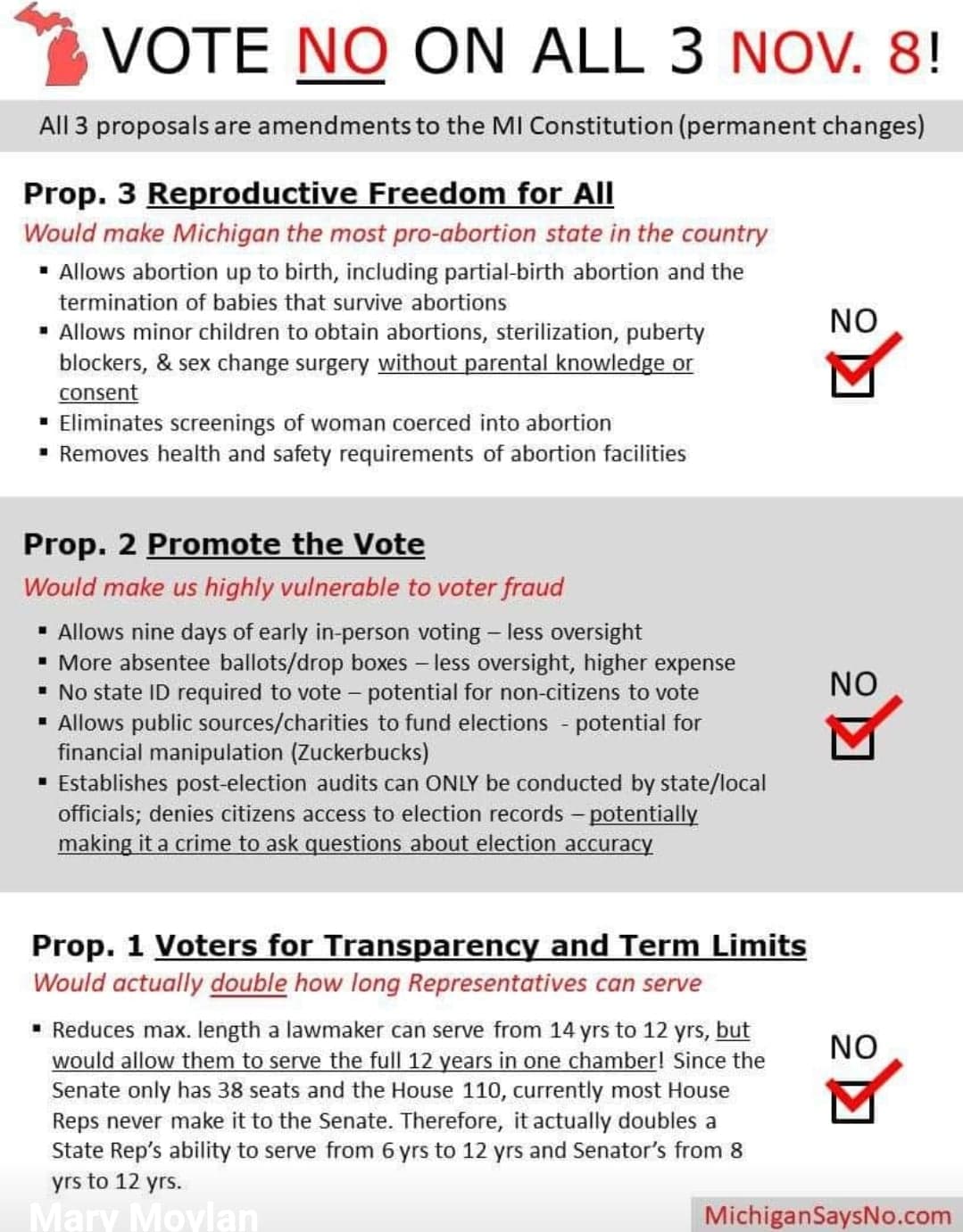 Carrie will add the Proposition Information handout to the voter guide. (See attached.) Carrie also has the exact wording for Propositions 2 & 3, but could not find the exact verbiage for Proposition 1. It is to be noted that State Sen. Jeremy Moss (D-11) and Senate Majority Leader Mike Shirkey (R-16) are in support of Prop 1. And it was also recommended to the Republican Chairs that the people go to their churches and ask them to get involved by taking a stance and to hand out literature regarding Proposition 3.